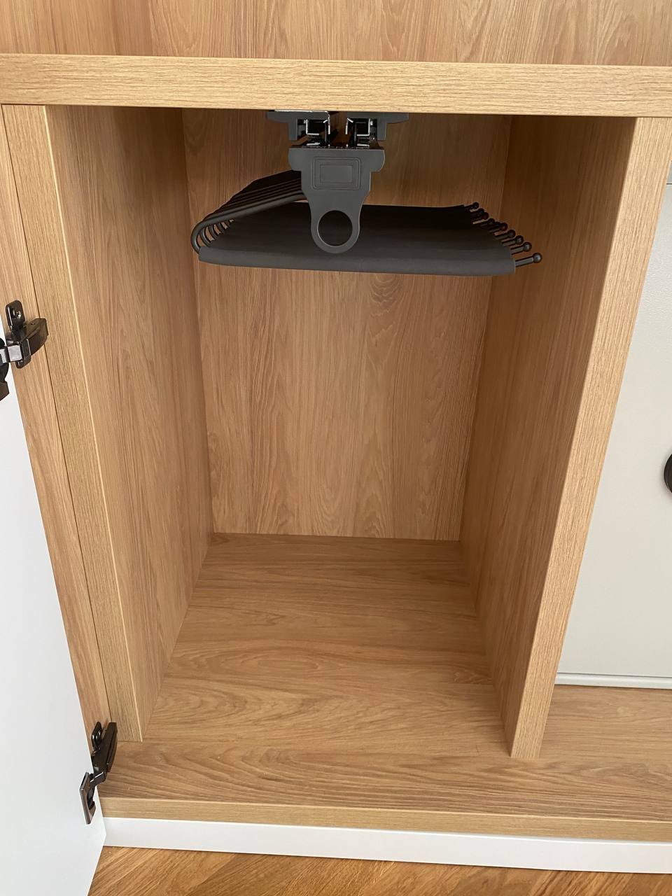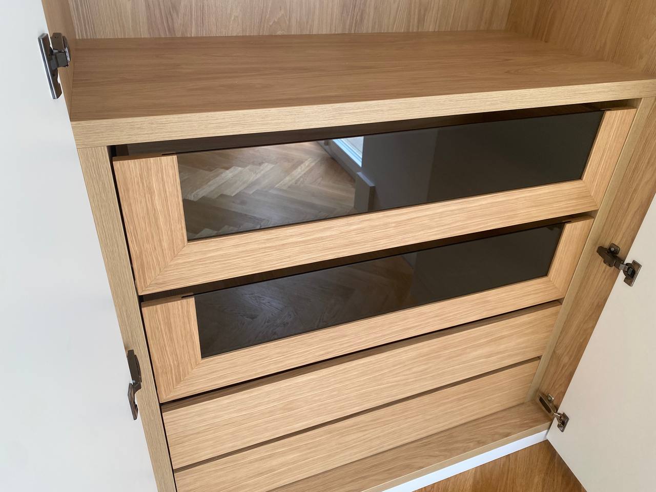Ящики с прозрачными фасадами, штанги для одежды и верхние полки обеспечивают оптимальную организацию пространства.