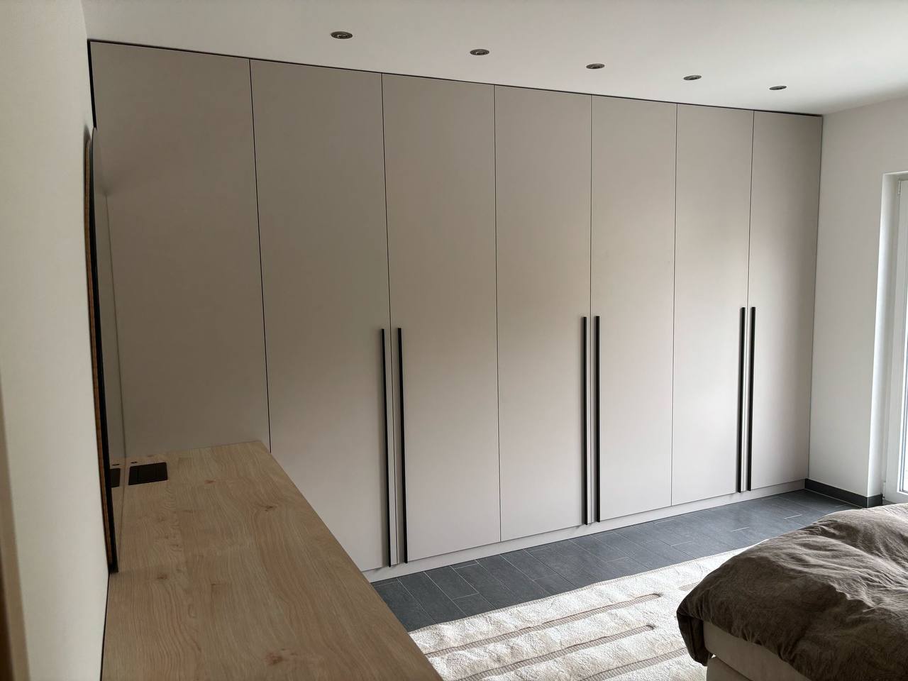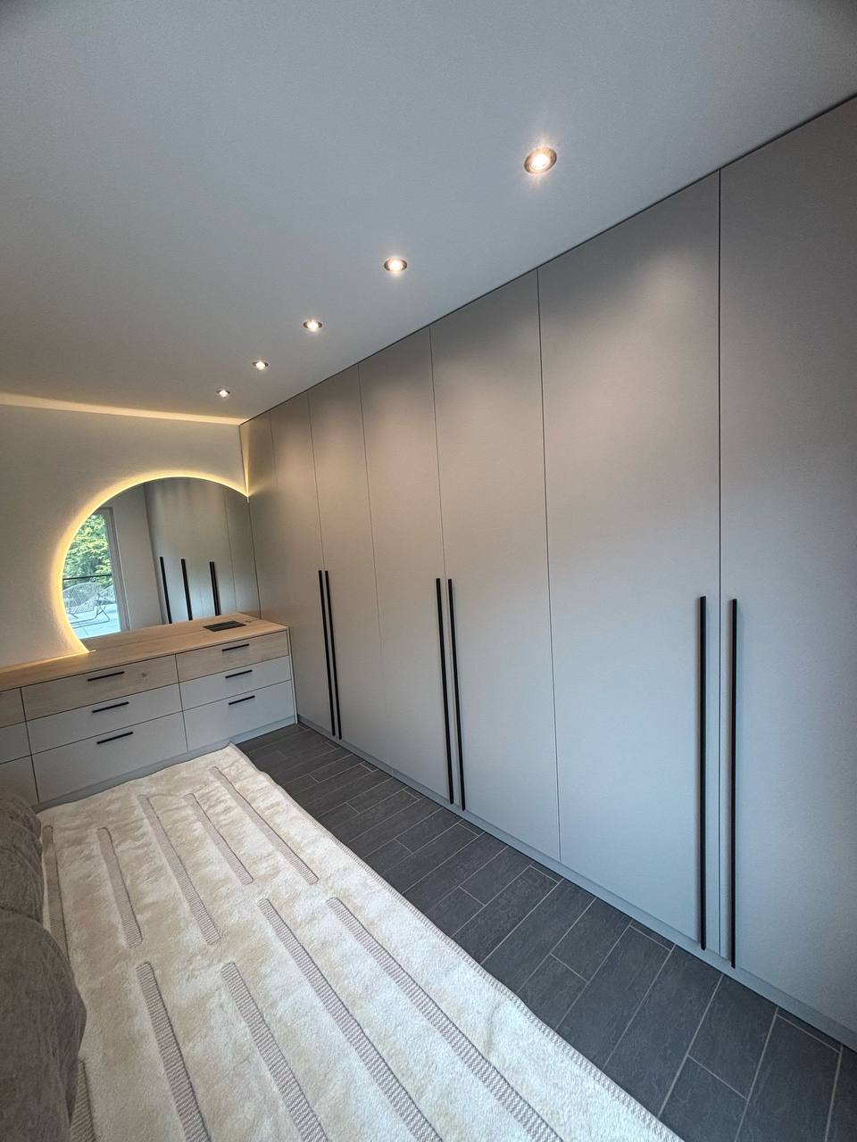 Полновысотная встроенная мебель обеспечивает просторное место для хранения, сохраняя при этом минималистичный внешний вид благодаря гладким фасадам и изящным вертикальным ручкам.