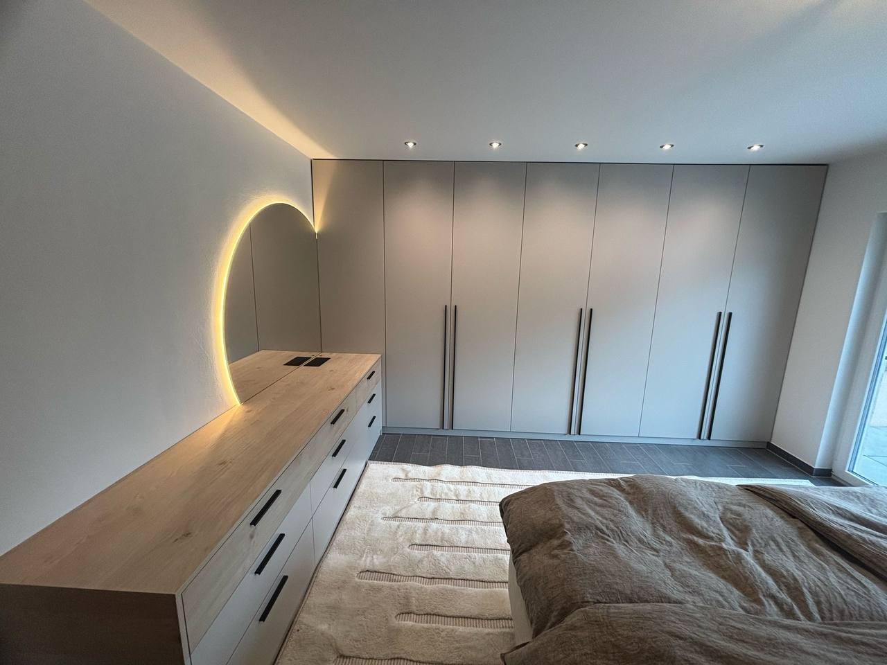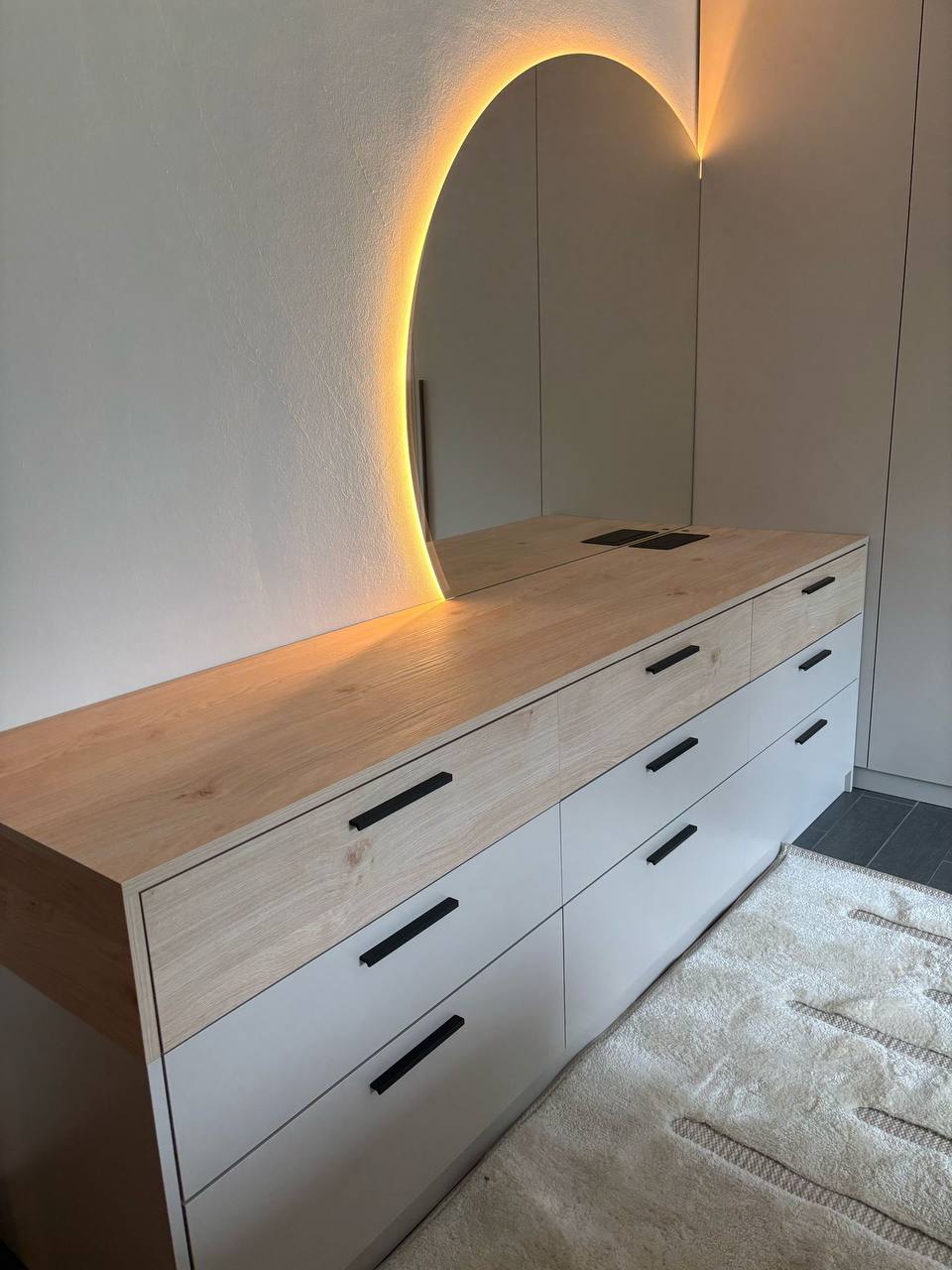 Дополнением служит туалетный столик с натуральной деревянной столешницей и зеркалом с мягкой LED-подсветкой, придающей пространству тепло и утончённый характер.