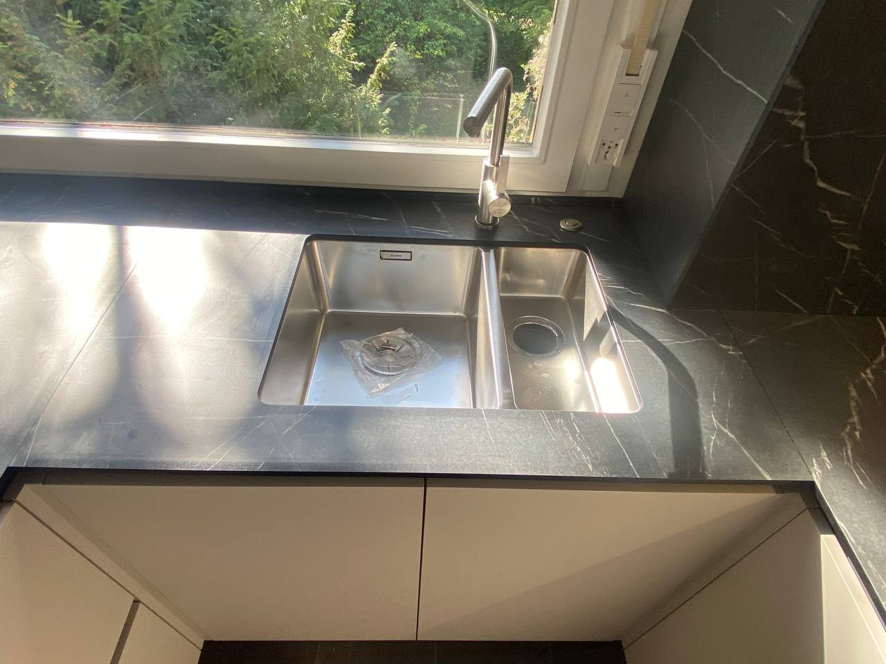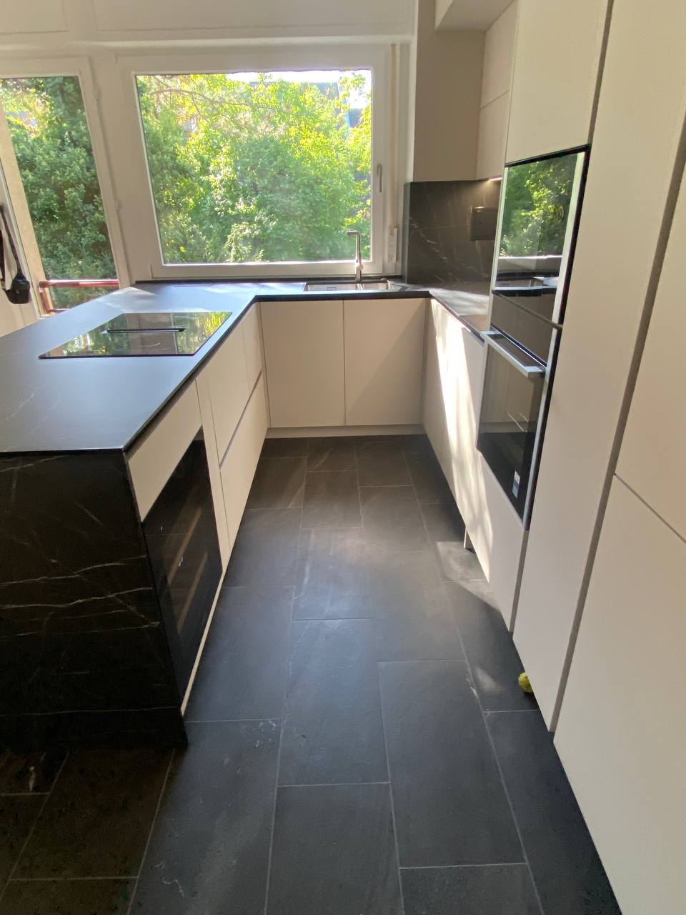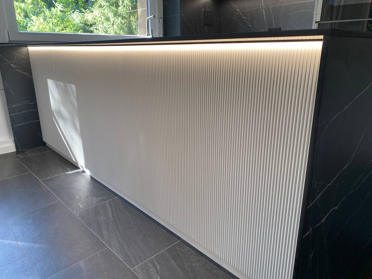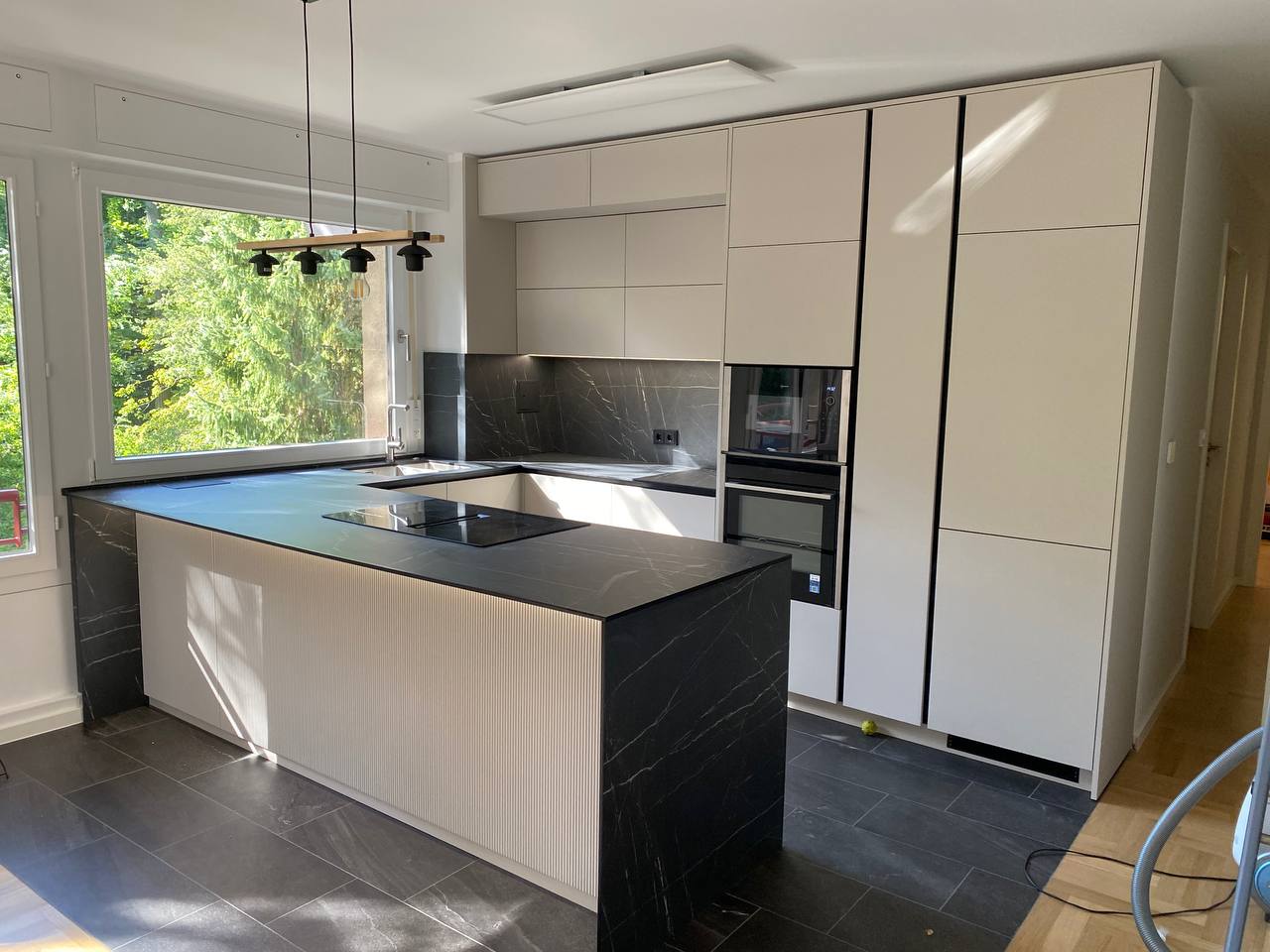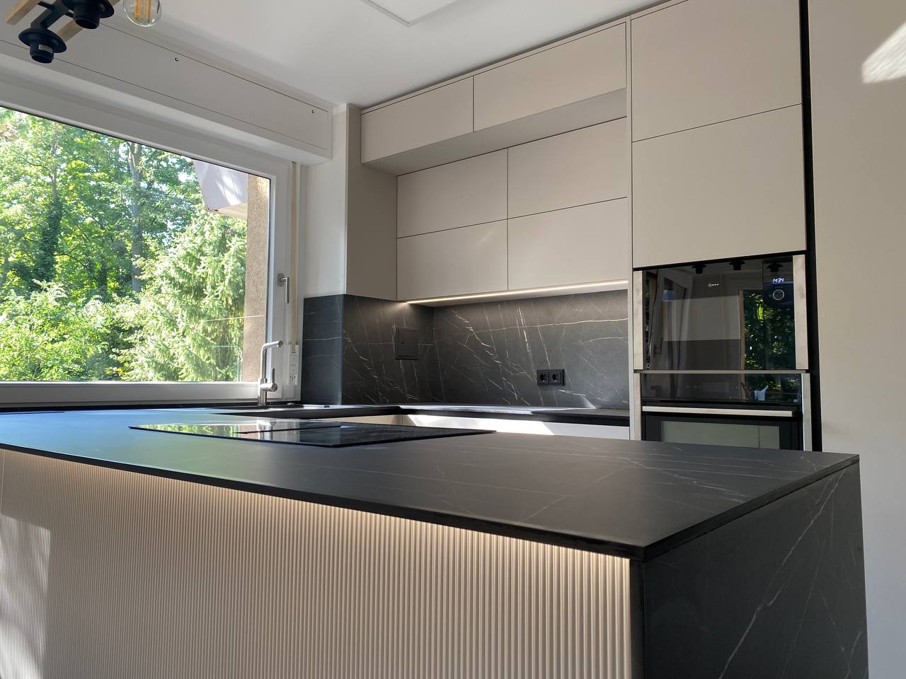 Реализация выполнена в квартире и выдержана в современном минималистичном стиле. Светлые фасады формируют лёгкую и универсальную основу, а контрастные чёрные элементы и мраморная столешница придают интерьеру глубину и элегантность. Центральным элементом выступает функциональный остров с вертикальными ламелями и варочной панелью — он объединяет рабочую зону и место встреч домочадцев. Большие окна обеспечивают естественное освещение, подчёркивая чистоту форм и изысканные материалы.