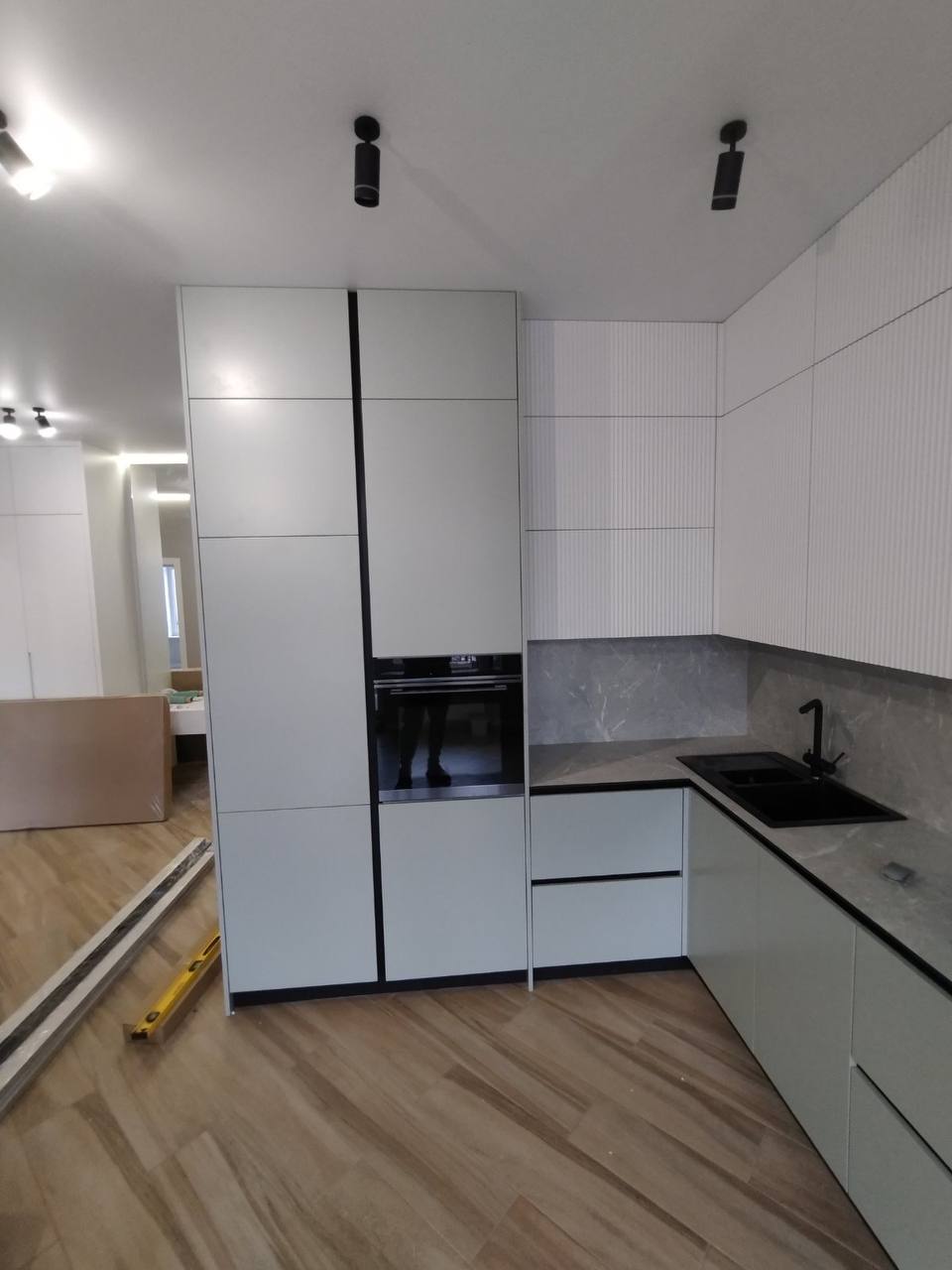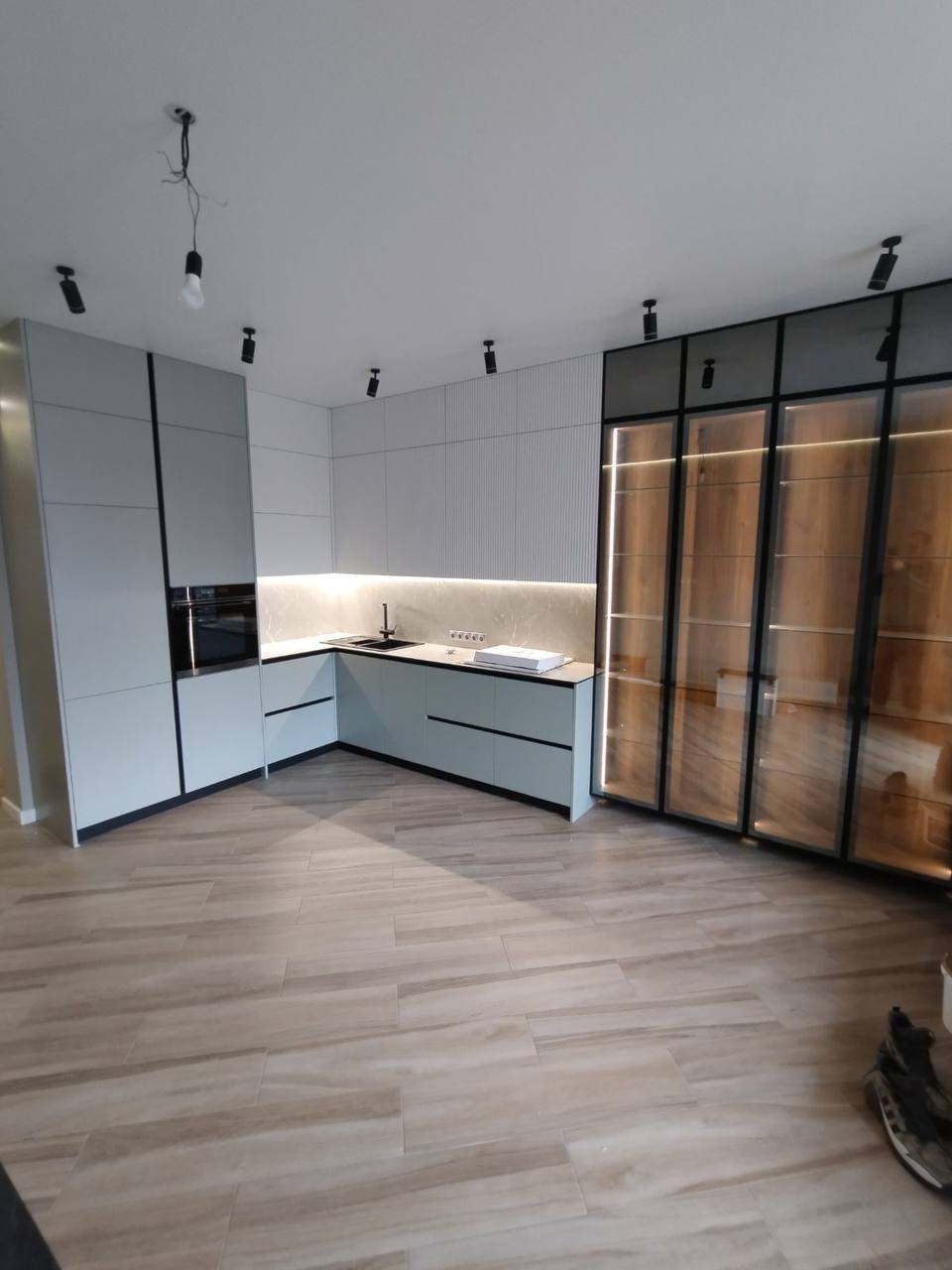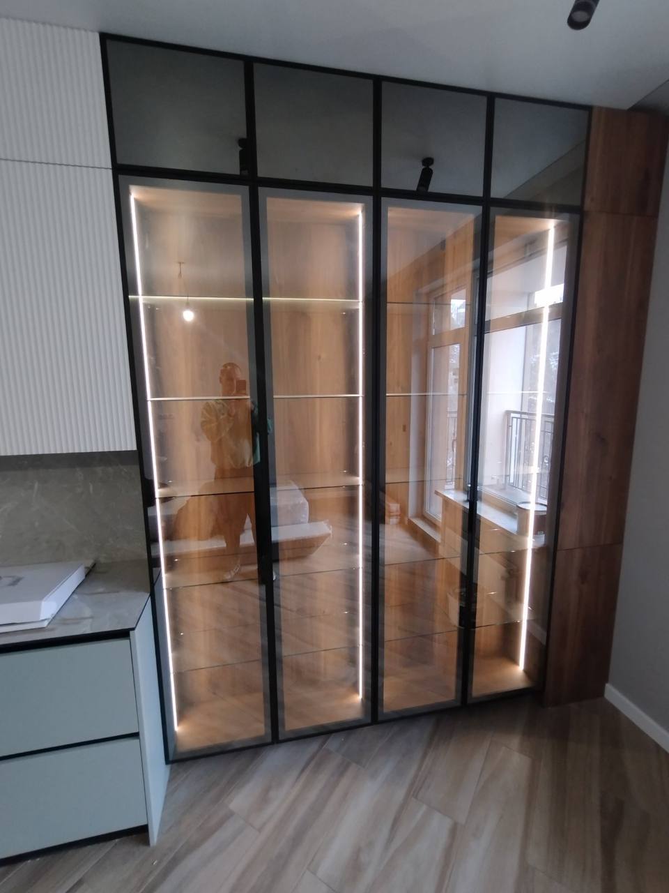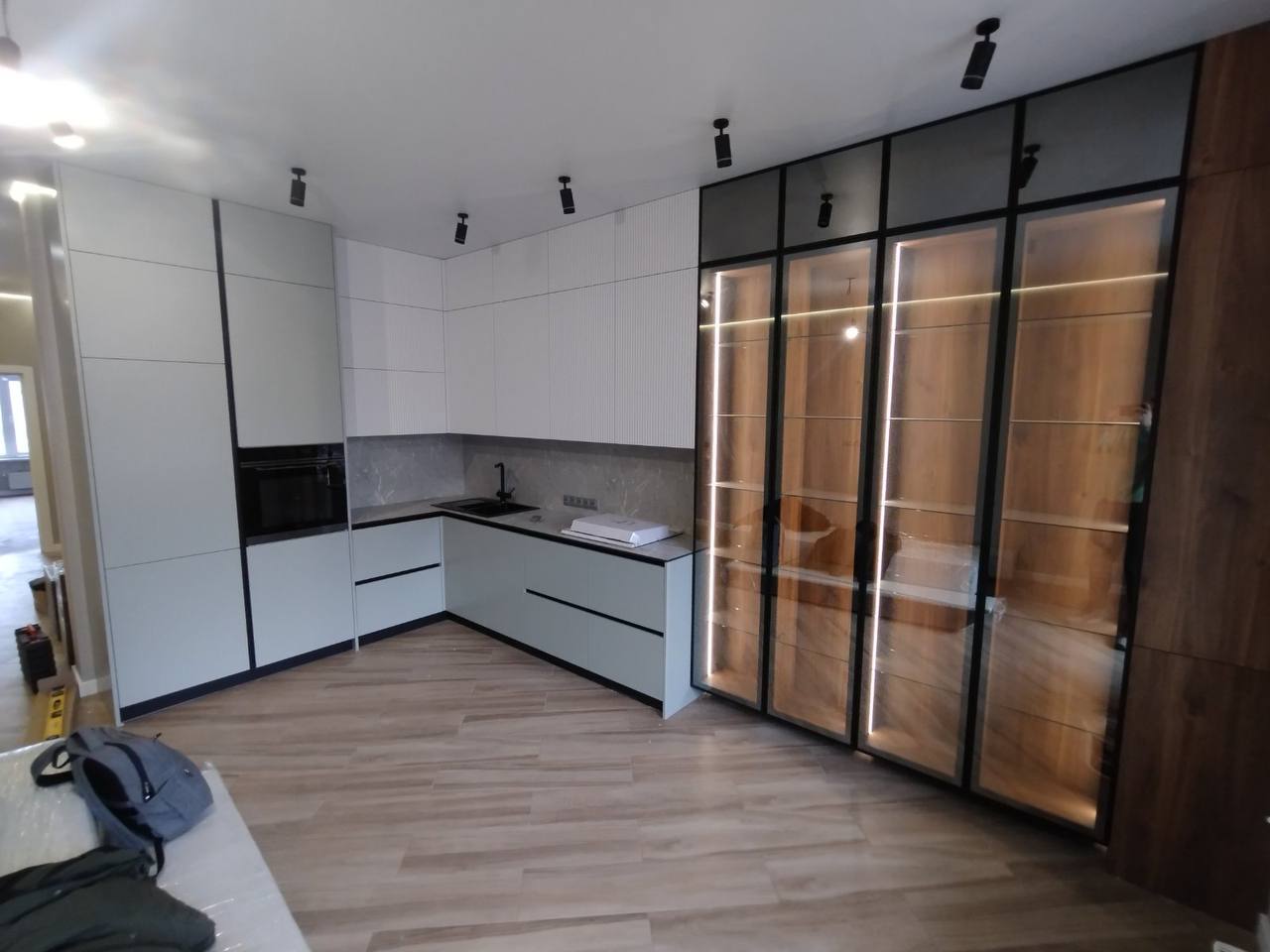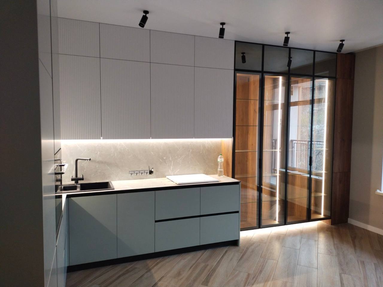 Реализация выполнена в квартире, сочетая минималистичные фасады с тонкой рифлёной текстурой и крупными стеклянными витринами. Светлая кухонная мебель формирует лёгкую и гармоничную композицию, которую дополняет эффектная экспозиционная зона с LED-подсветкой и тёплыми деревянными элементами. Чёрная столешница и тёмные декоративные акценты подчёркивают современный характер проекта, а эргономичная планировка обеспечивает удобство в повседневном использовании и максимальное использование пространства.