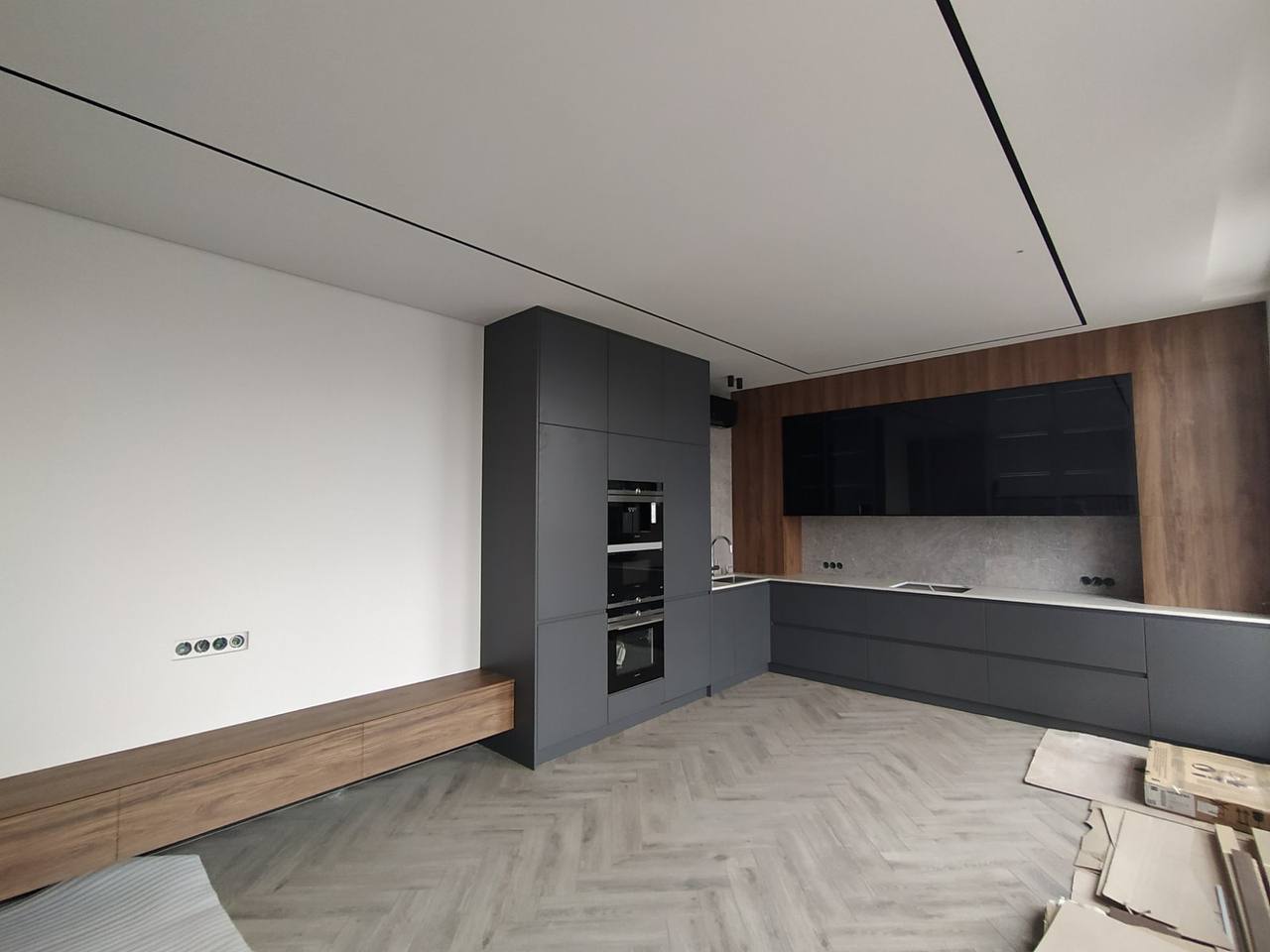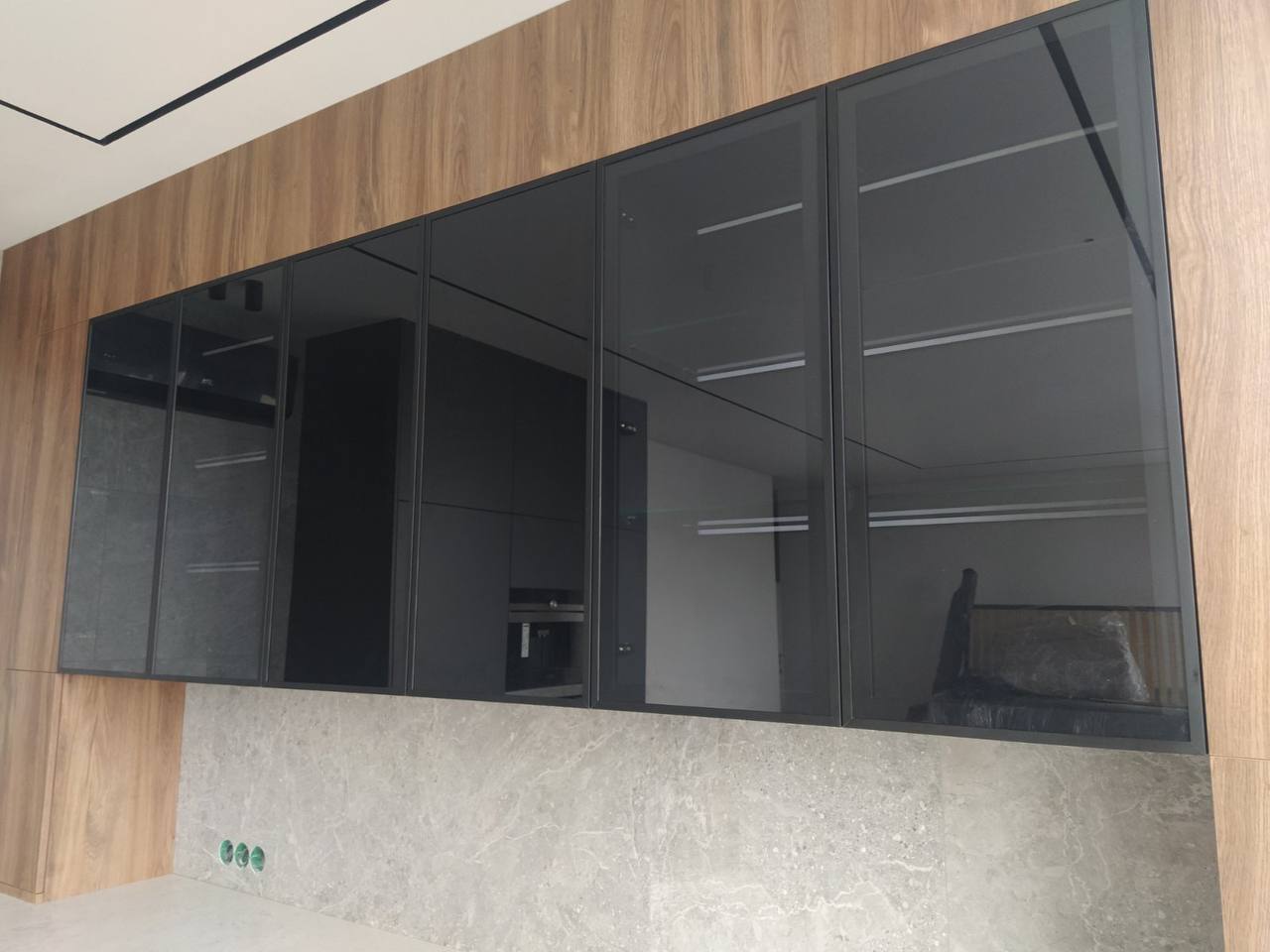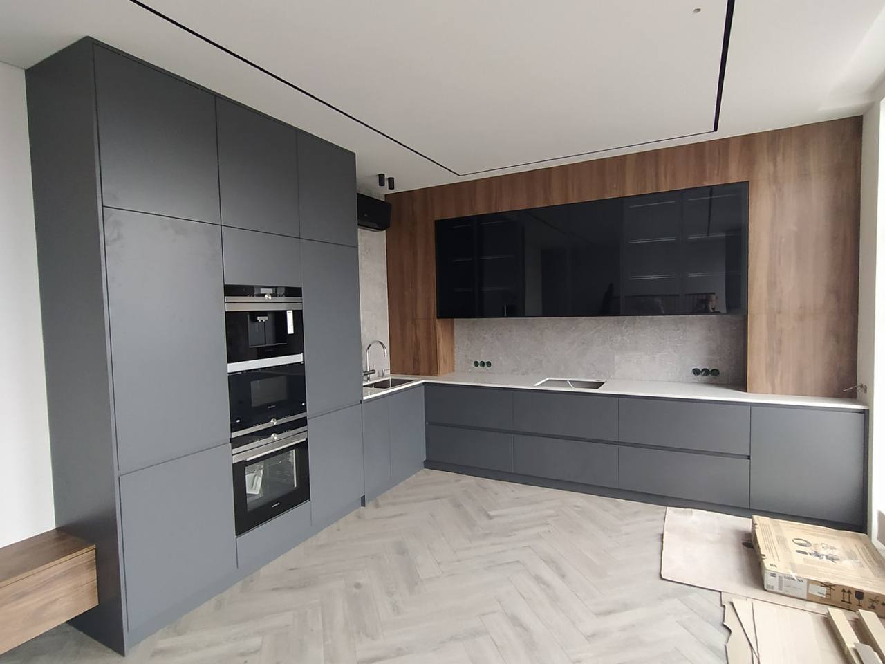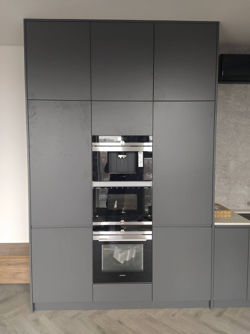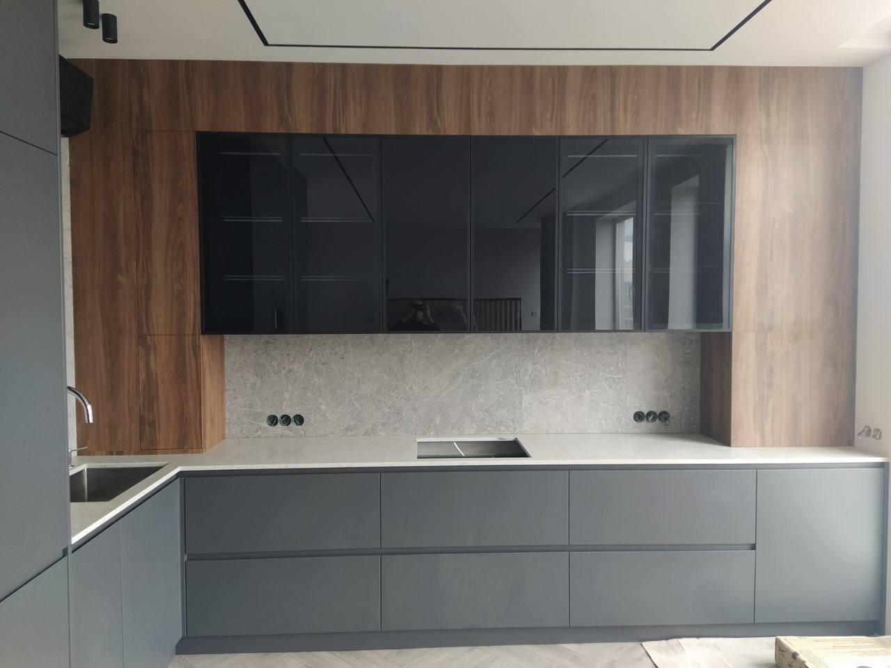 Реализация выполнена в квартире, в современном и сдержанном стиле. Графитовые матовые фасады формируют элегантную цельную поверхность, которую смягчает крупная панель из натурального дерева в зоне верхних шкафов. Стеклянные глянцевые фасады добавляют композиции лёгкость и глубину, а светлая столешница и встроенная техника подчёркивают минималистичный характер проекта. Продуманная планировка высоких модулей обеспечивает удобное хранение и комфортное использование кухонного пространства.