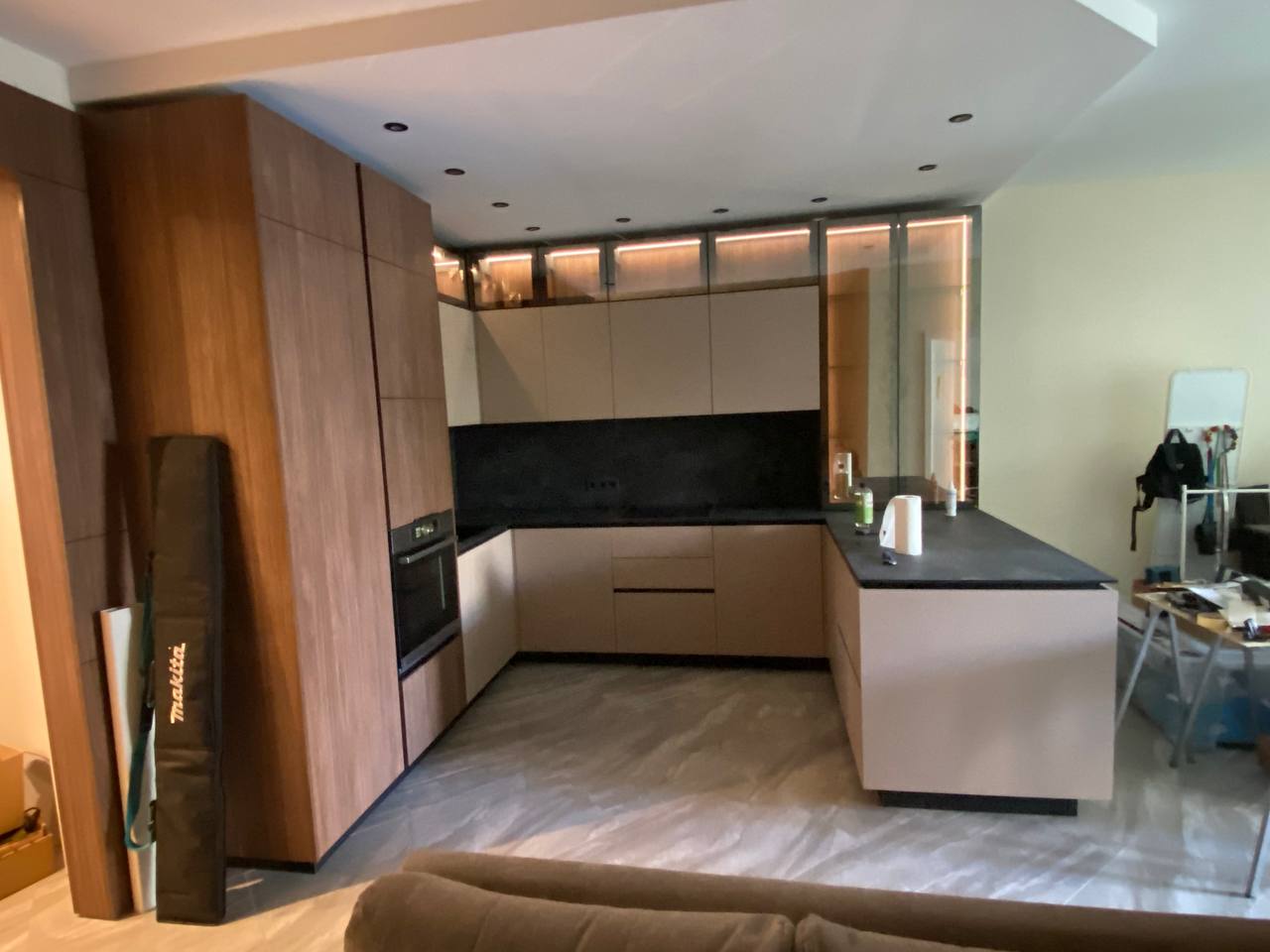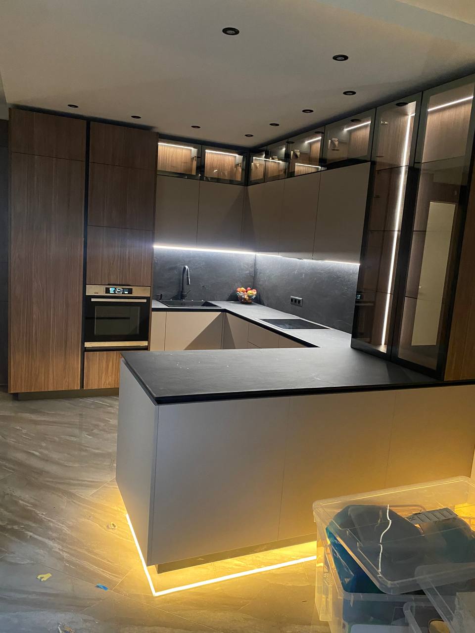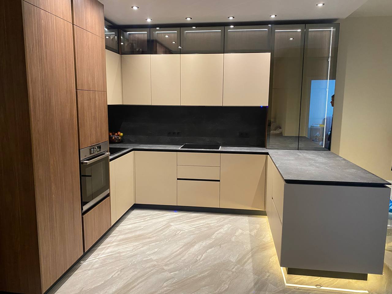 Реализация выполнена в квартире и выдержана в тёплой палитре бежевых оттенков и натурального дерева. Матовые фасады создают спокойную минималистичную основу, которую дополняют стеклянные витрины с мягкой подсветкой и тёмная каменная столешница. LED-подсветка цоколя придаёт проекту лёгкость, создавая эффект парящей мебели. Продуманная планировка в форме буквы «U» обеспечивает удобство в использовании и функциональную организацию рабочей зоны.