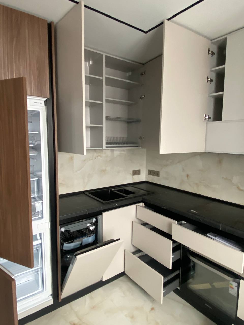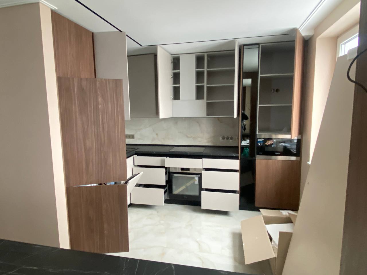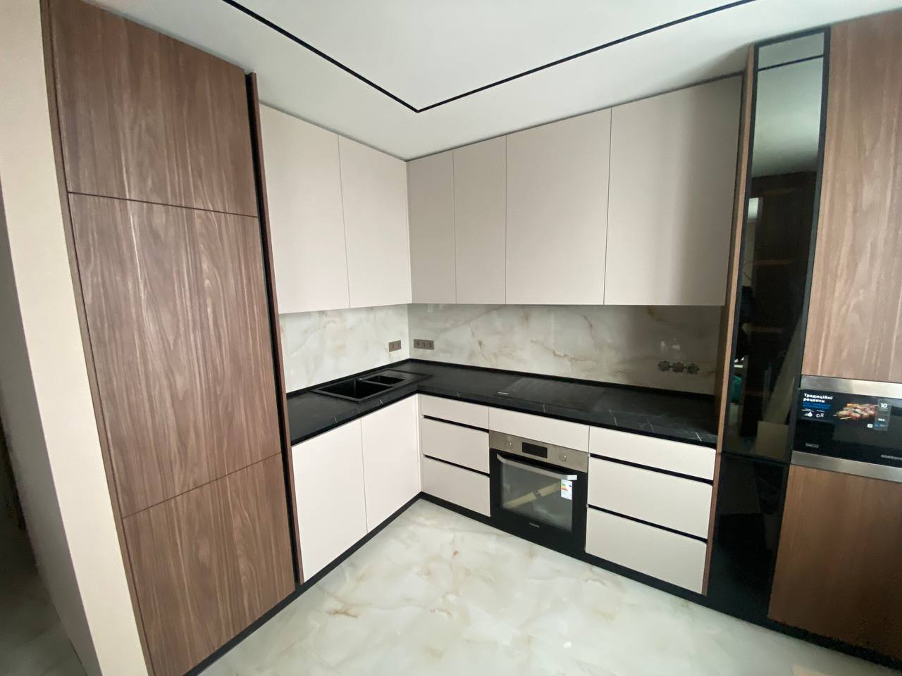 Проект выполнен в элегантном минималистичном стиле. Пространство отличается гармоничной цветовой палитрой, объединяющей тёплые оттенки дерева, матовую белизну и чёрные акценты. Кухонная мебель точно подогнана под нишу, формируя чёткую геометричную композицию и создавая ощущение целостности интерьера.