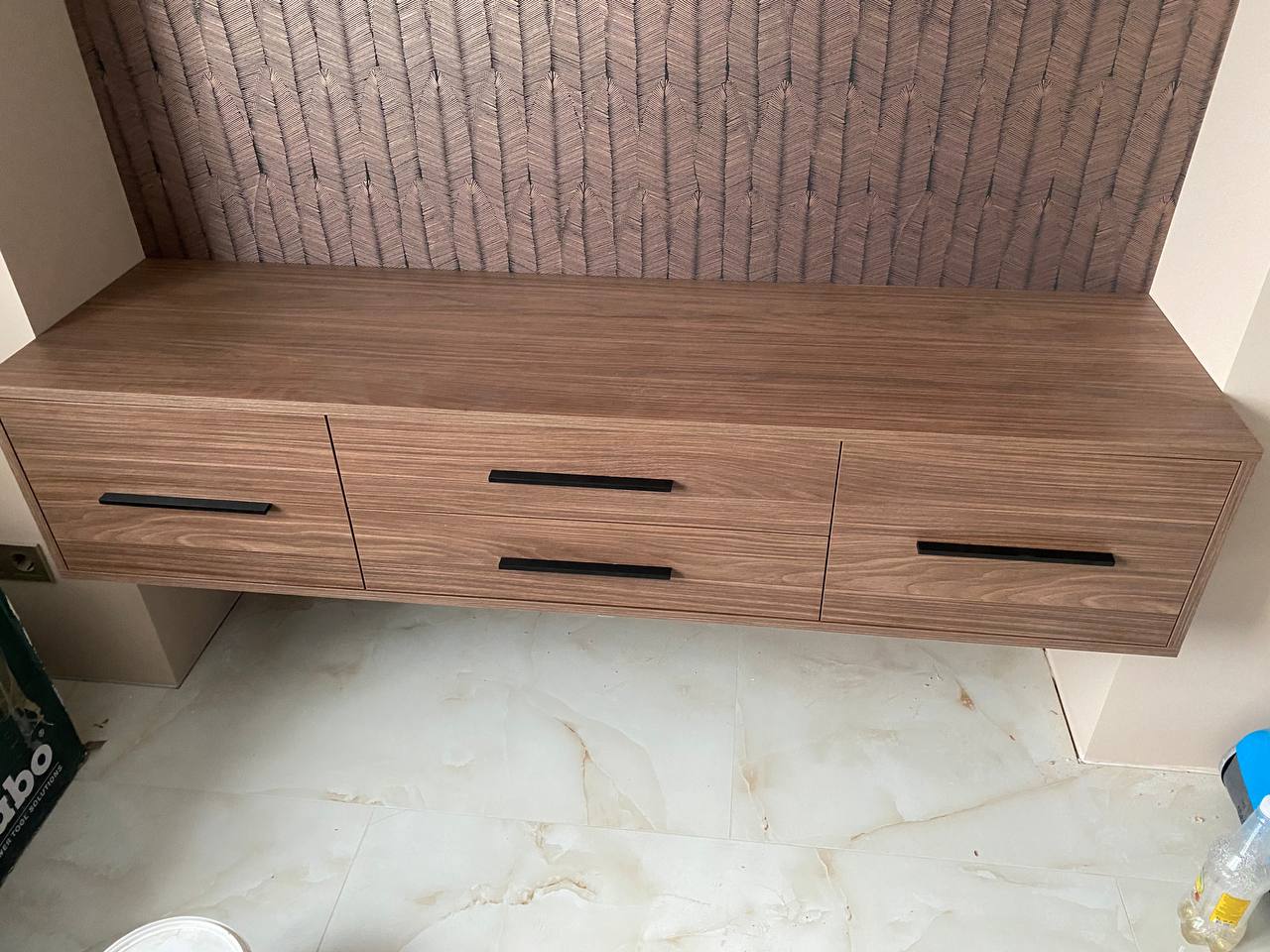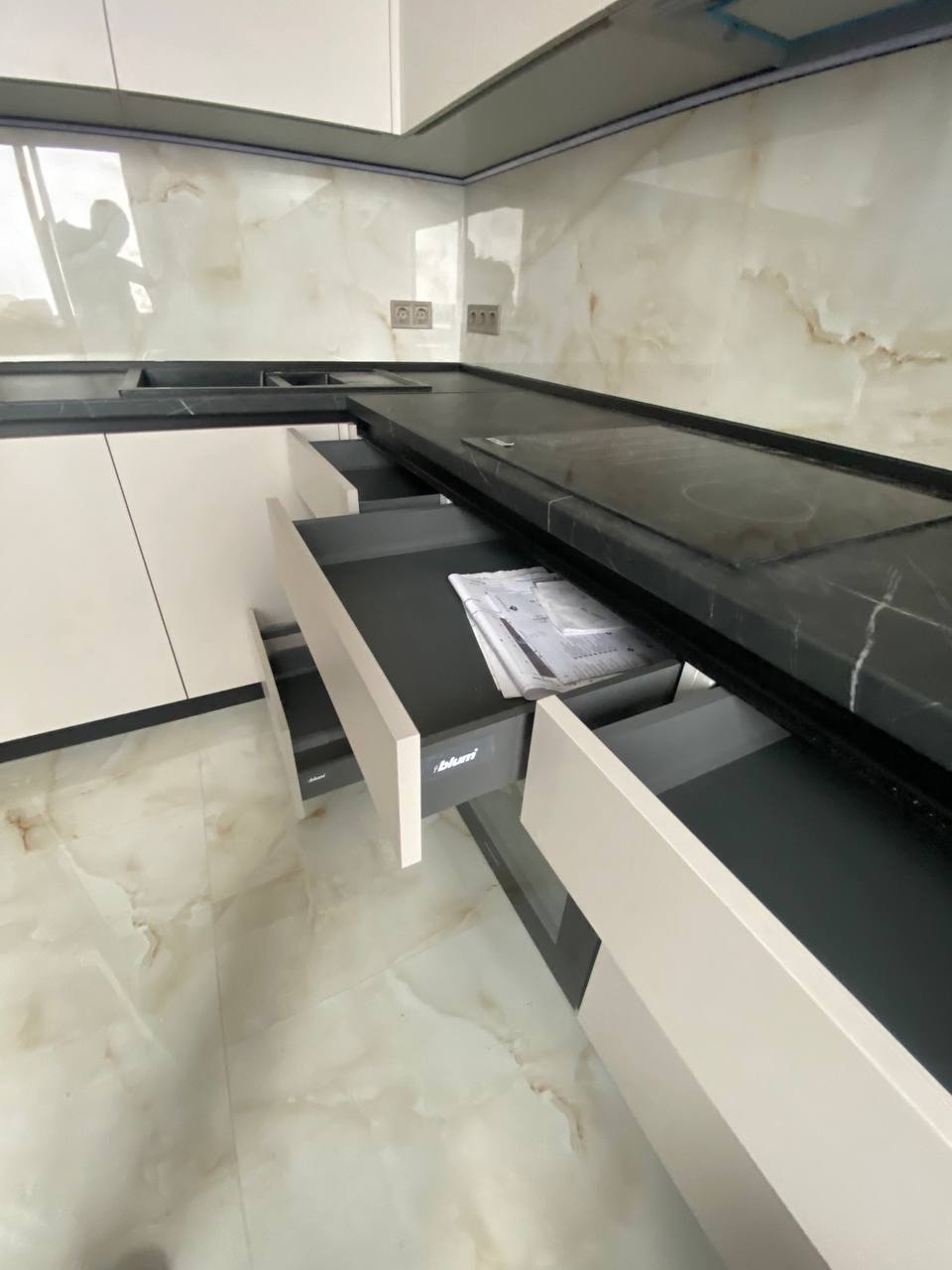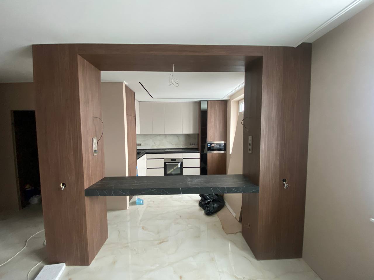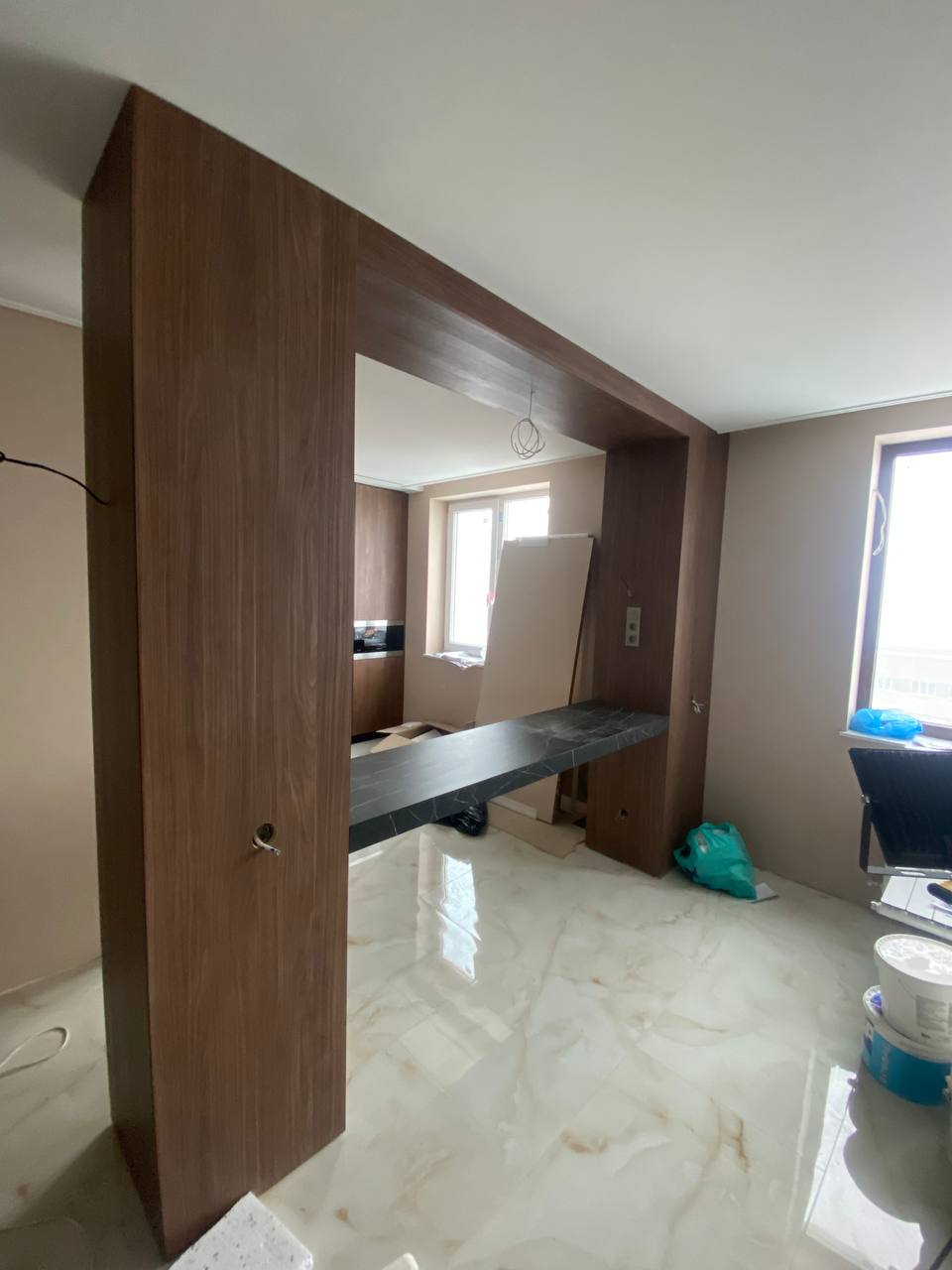 Проект выполнен в элегантном минималистичном стиле. Пространство отличается гармоничной цветовой палитрой, объединяющей тёплые оттенки дерева, матовую белизну и чёрные акценты. Кухонная мебель точно подогнана под нишу, формируя чёткую геометричную композицию и создавая ощущение целостности интерьера.