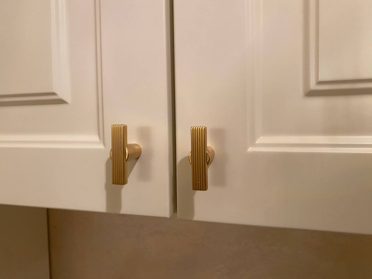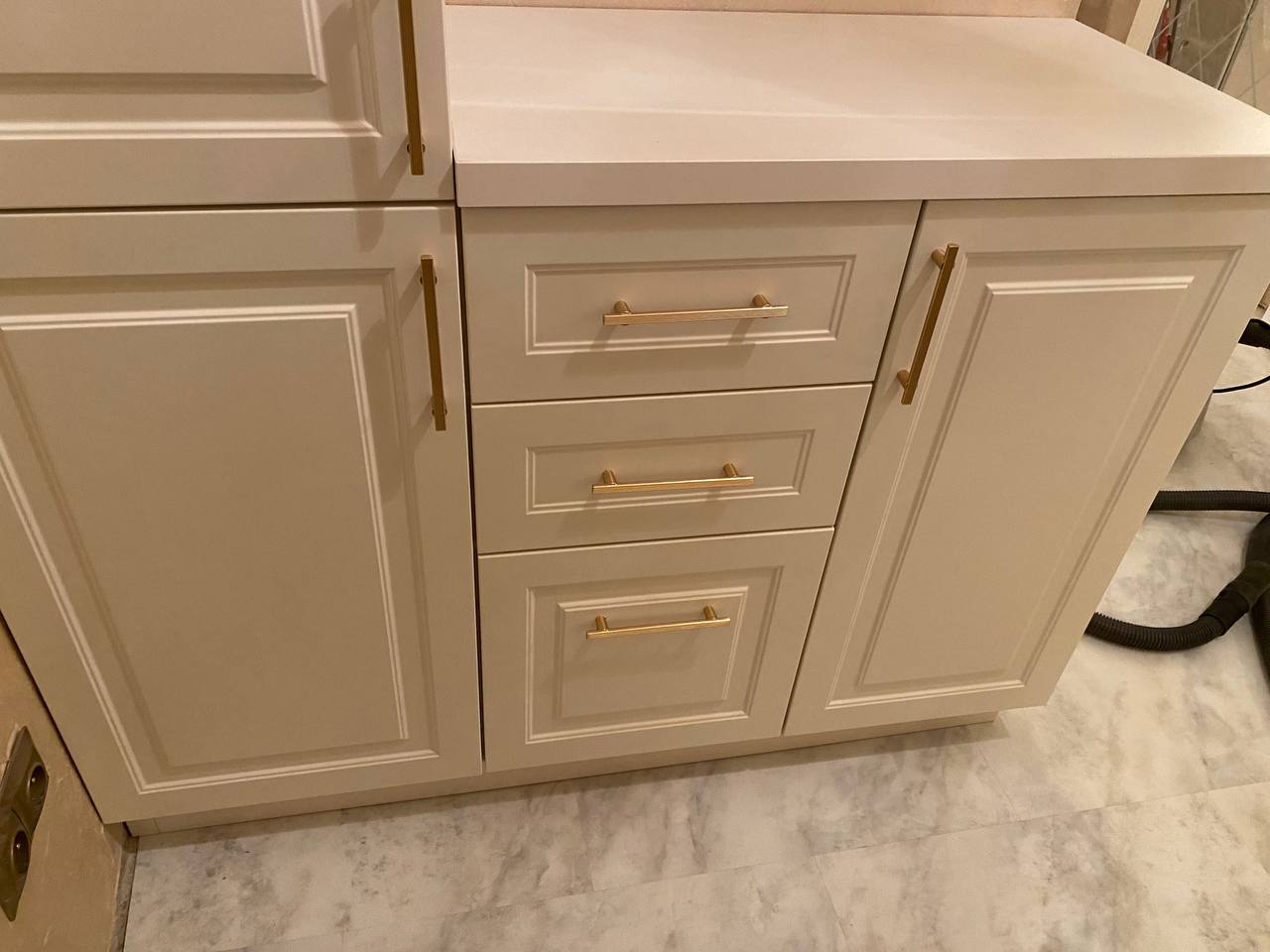 Мебель в оттенке слоновой кости с декоративными фрезеровками и золотыми ручками подчёркивает роскошный характер пространства.