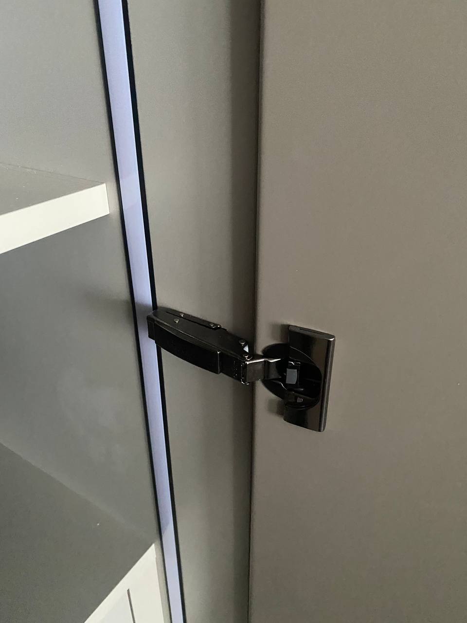 Элегантная встроенная гардеробная с лакированными фасадами и деревянными акцентами