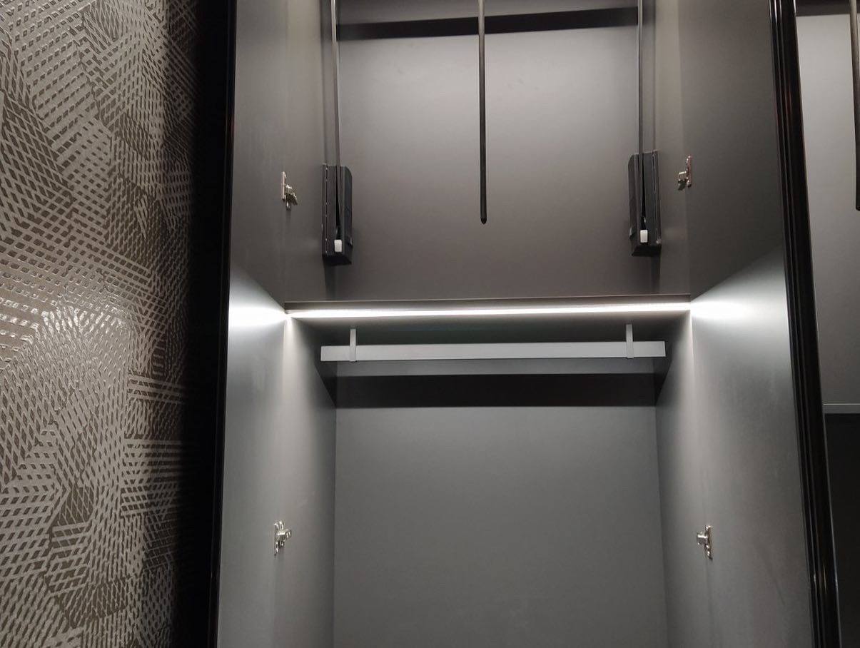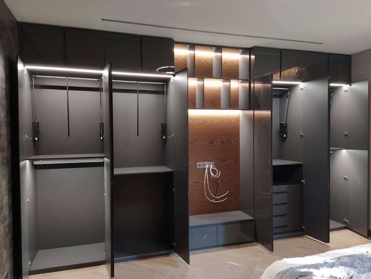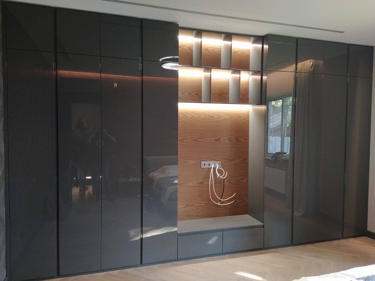 Реализация с блестящими фасадами и тёплыми деревянными элементами. Внутри применена система подъёмных штанг, многочисленные полки и ящики, что обеспечивает удобную организацию одежды. LED-подсветка в каждой секции подчёркивает элегантность проекта и облегчает использование. Центральная панель с деревянными вставками и скрытым освещением создаёт эффект современной, тщательно продуманной зоны с атмосферой гостиничного уровня.