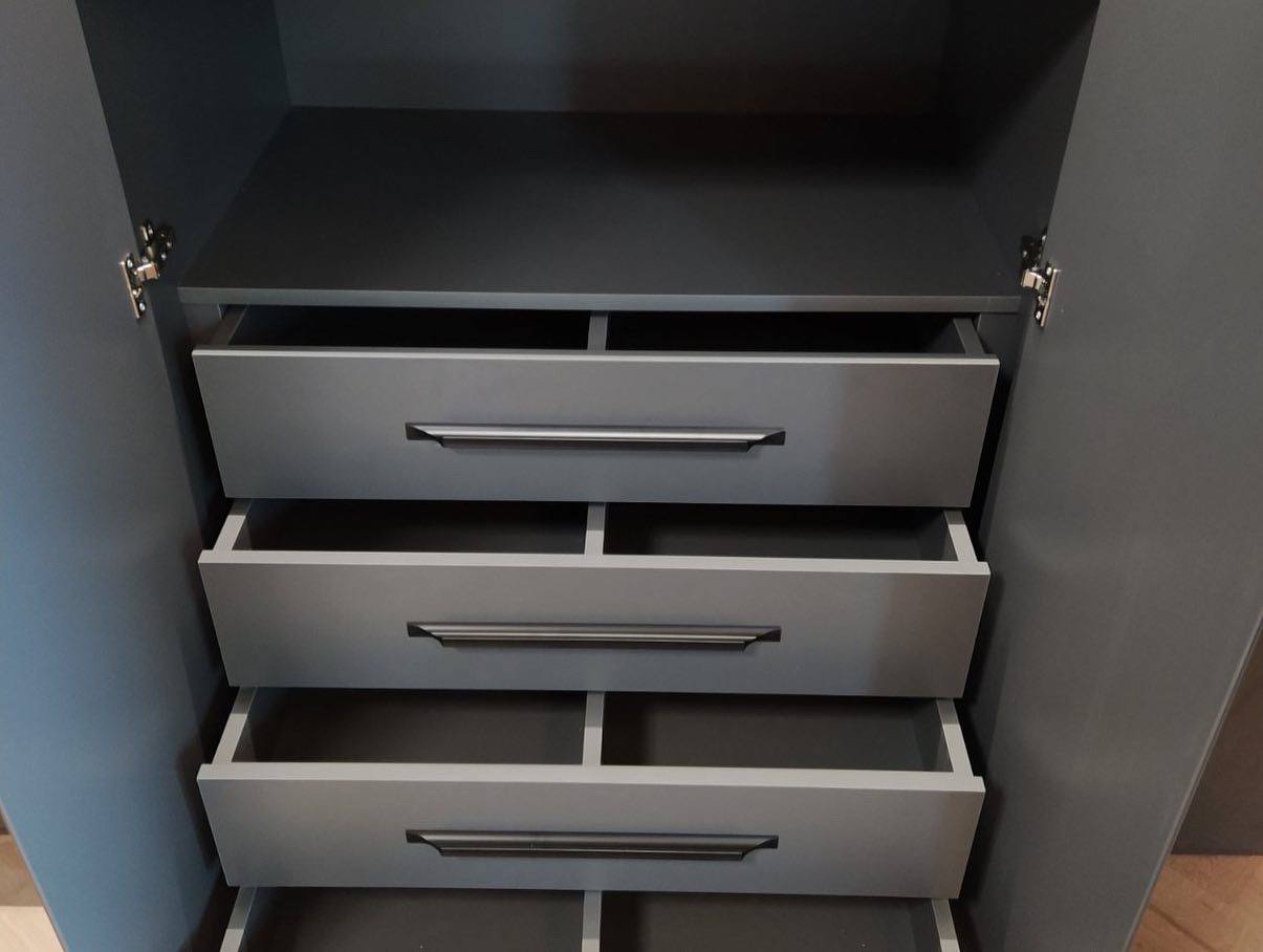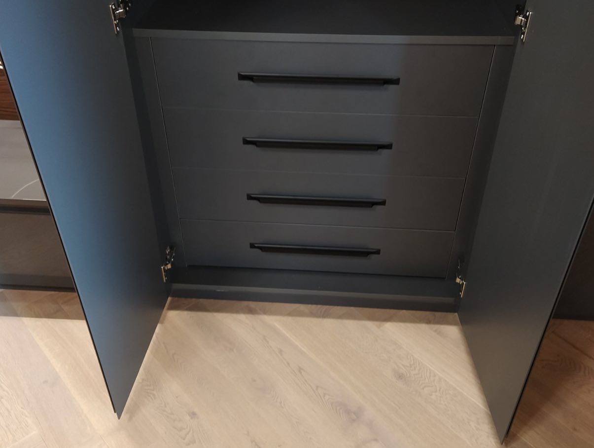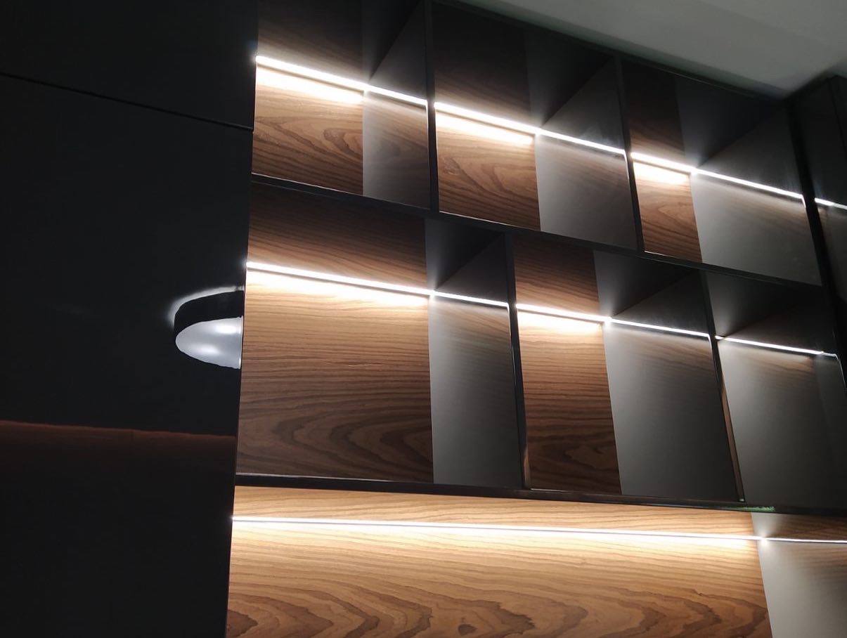 Реализация с блестящими фасадами и тёплыми деревянными элементами. Внутри применена система подъёмных штанг, многочисленные полки и ящики, что обеспечивает удобную организацию одежды. LED-подсветка в каждой секции подчёркивает элегантность проекта и облегчает использование. Центральная панель с деревянными вставками и скрытым освещением создаёт эффект современной, тщательно продуманной зоны с атмосферой гостиничного уровня.